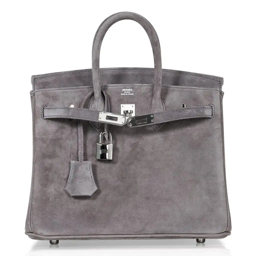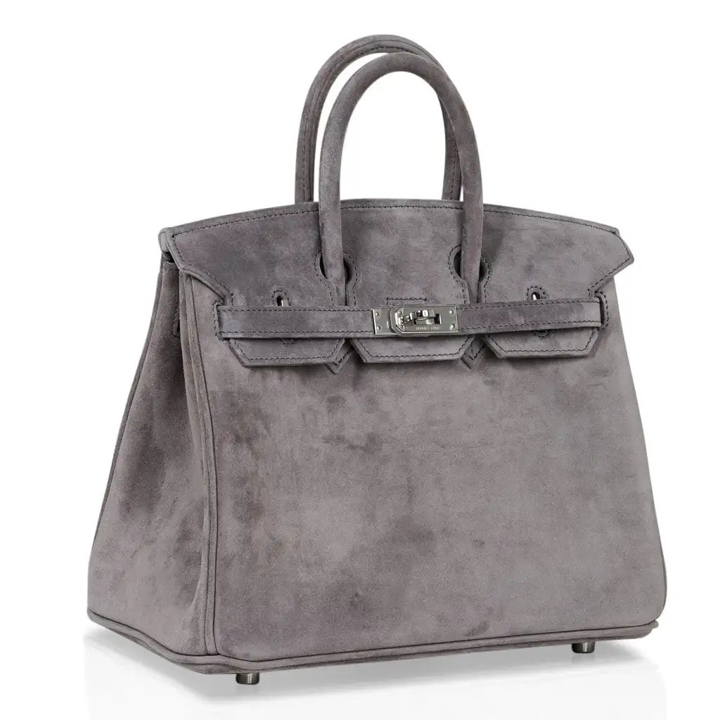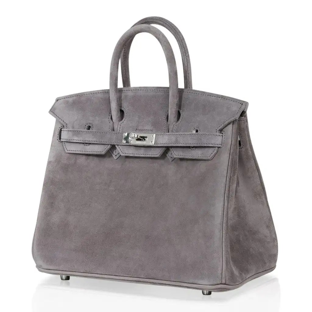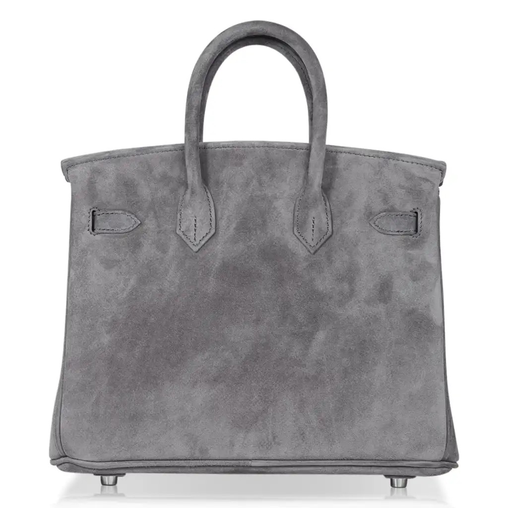 Guaranteed authentic Hermes Birkin 25 bag featured in Gris Fume Doblis (Suede).