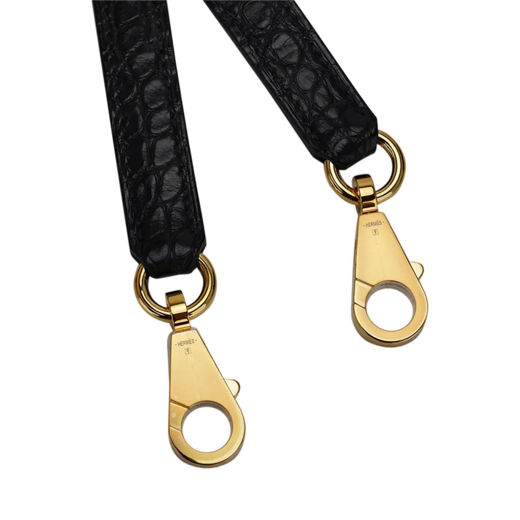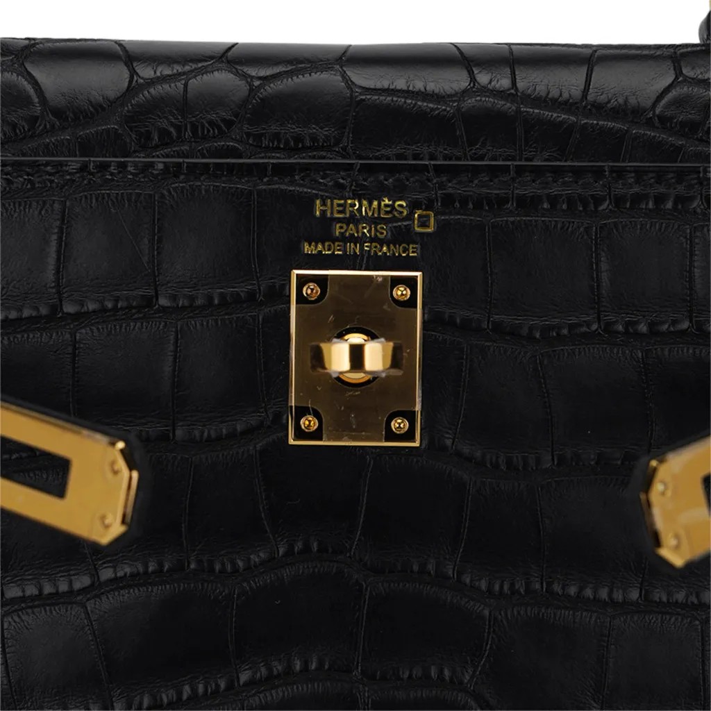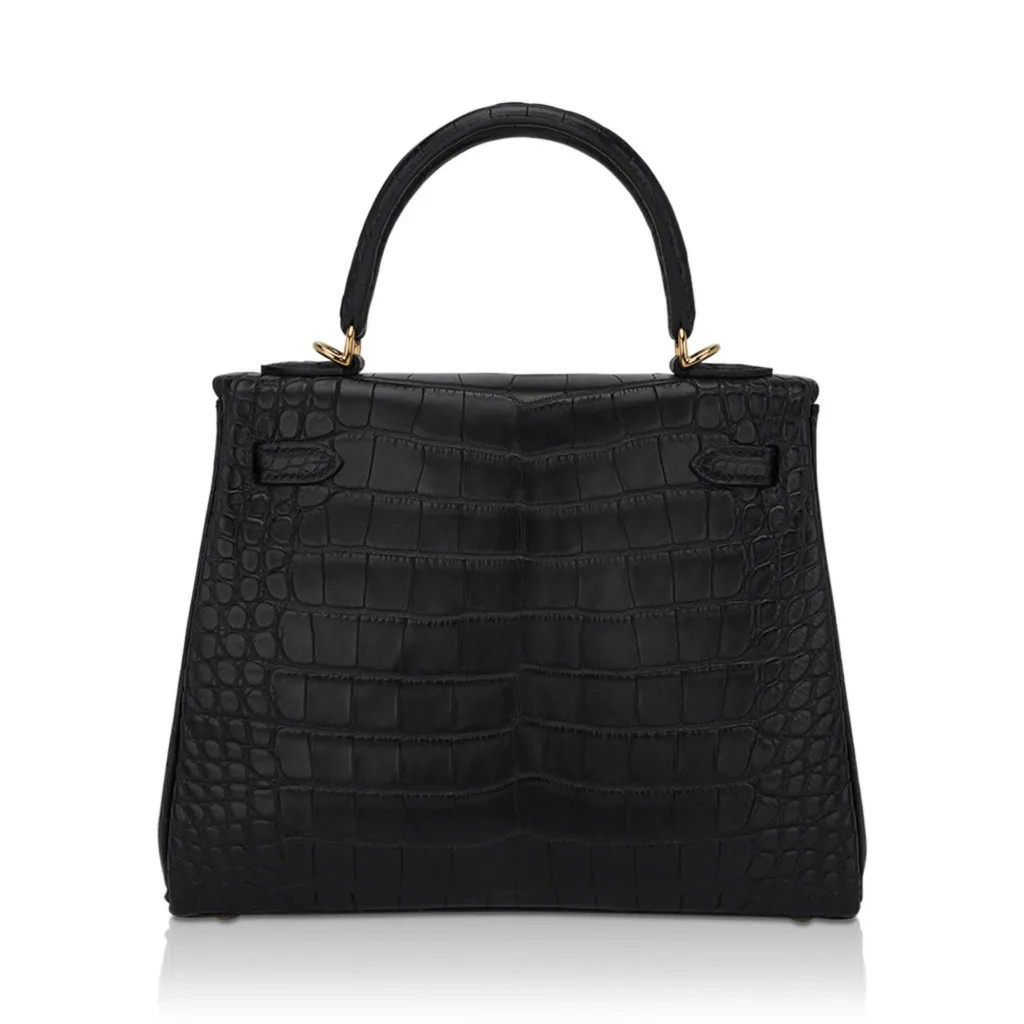 Guaranteed authentic Hermes Kelly 25 Retourne bag presented in classic Black Matte Alligator.