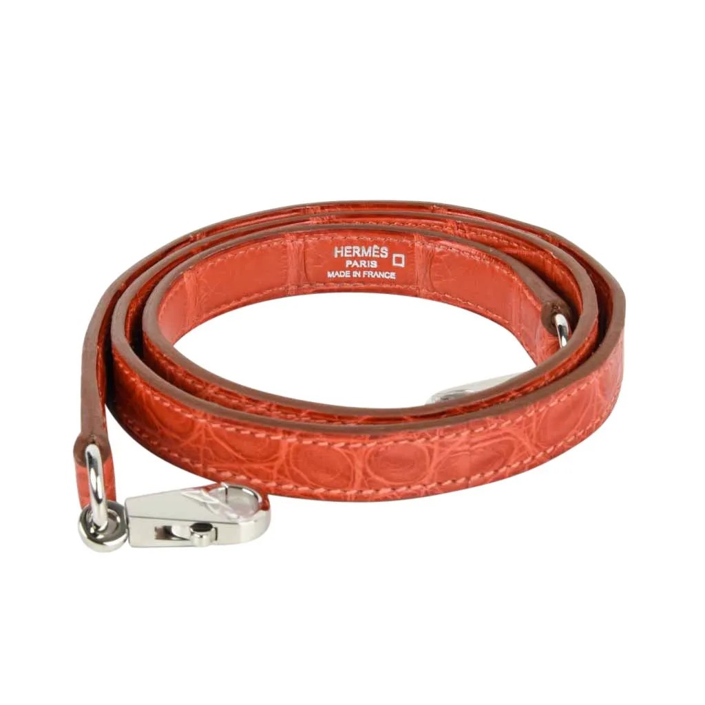 This Hermes Alligator Kelly bag is gorgeous in a soft Manhasset muddy red coral tone with fresh palladium hardware.