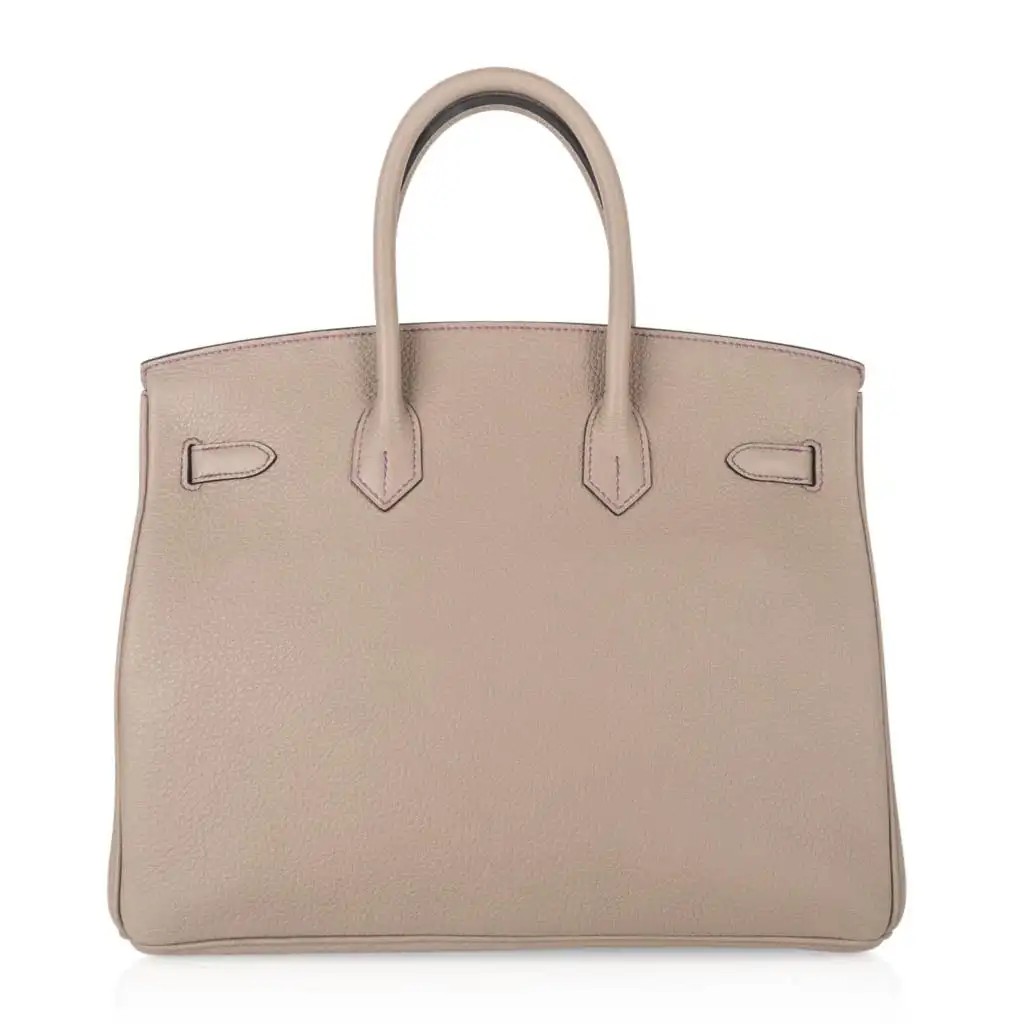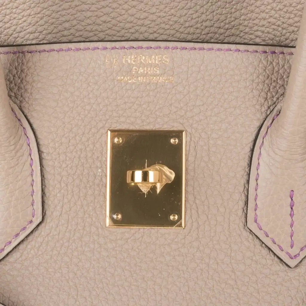Guaranteed authentic Hermes HSS Birkin 35 bag featured in subtle elegant tri colour rare Gris Tourterelle accentuated with purple top stitch.