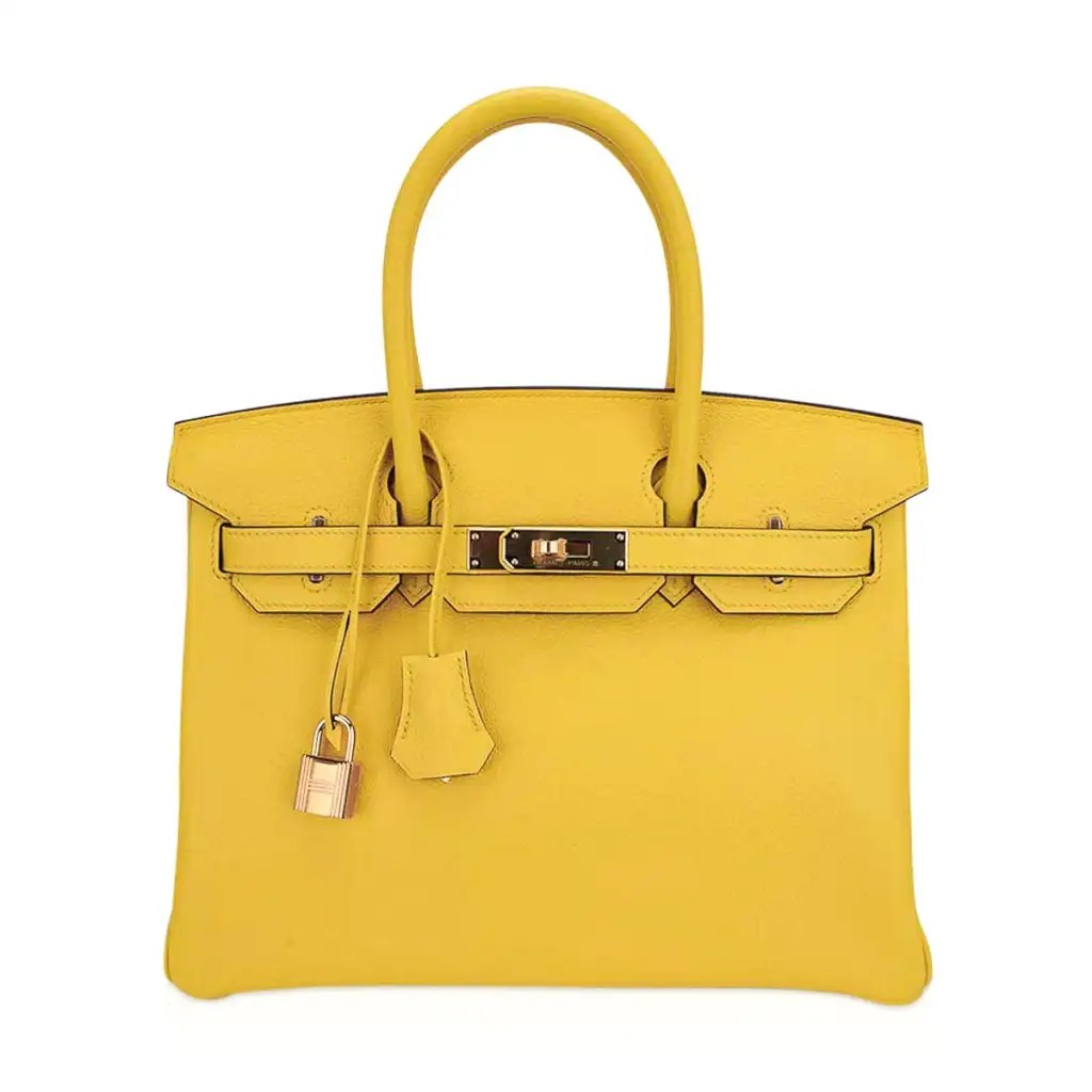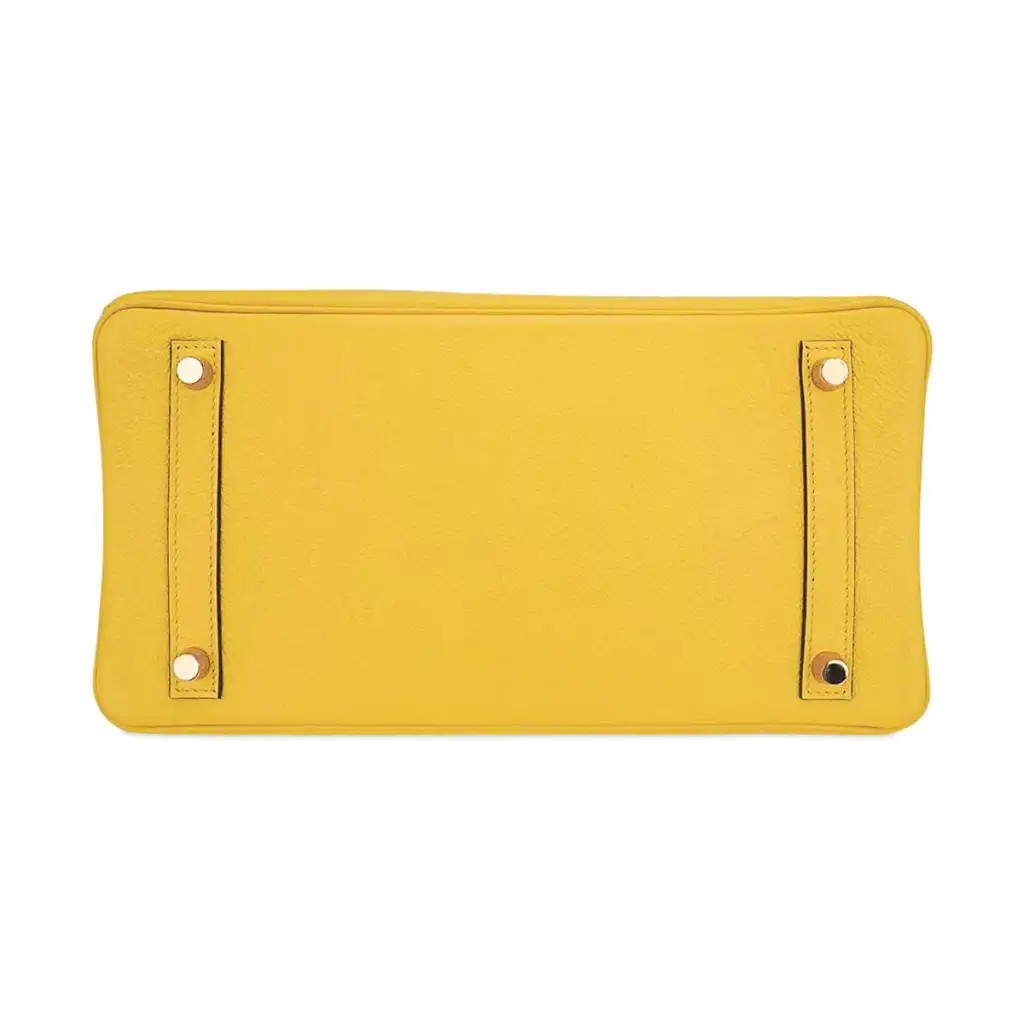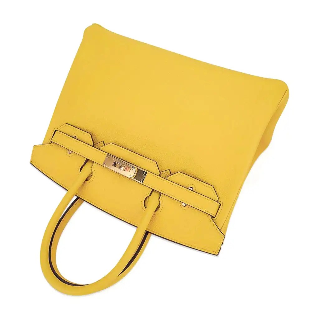 Hermes Birkin 30 bag featured in sunny Jaune de Naples with Gold interior.
