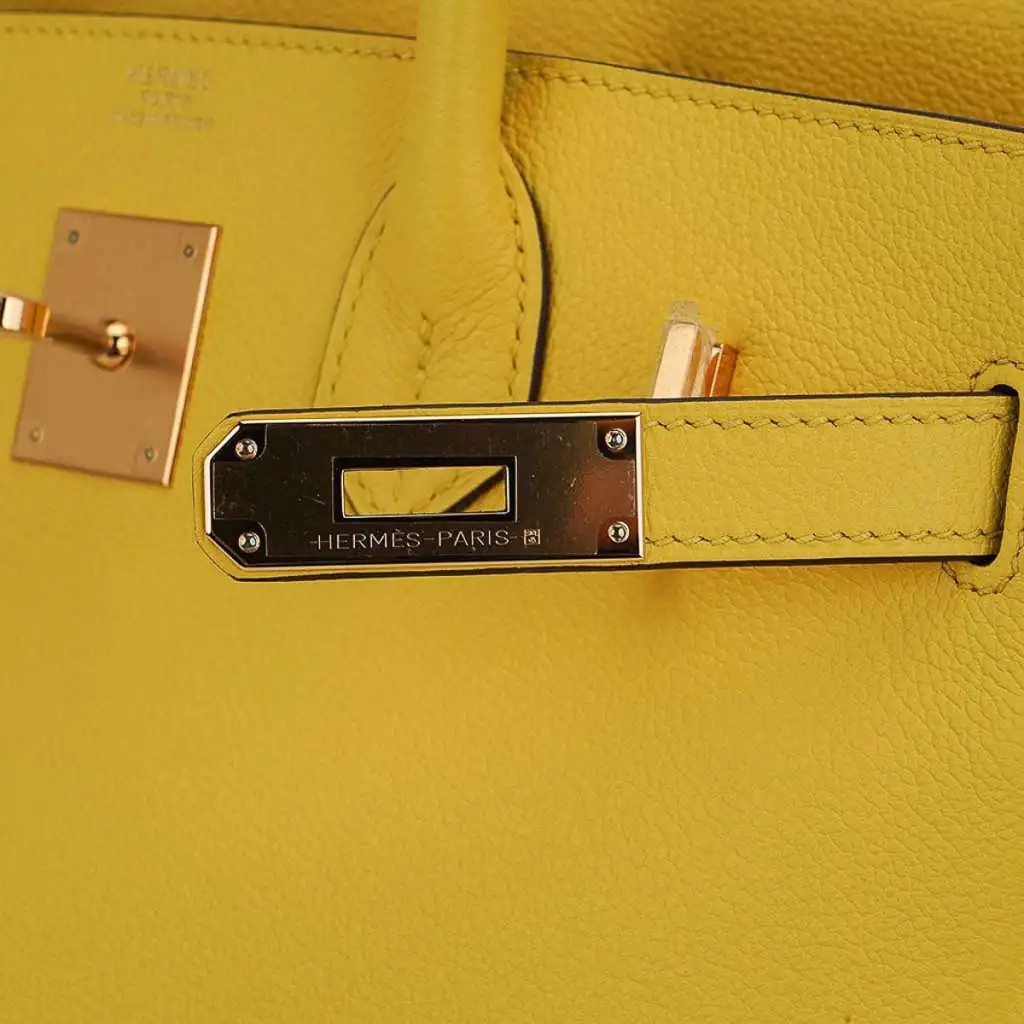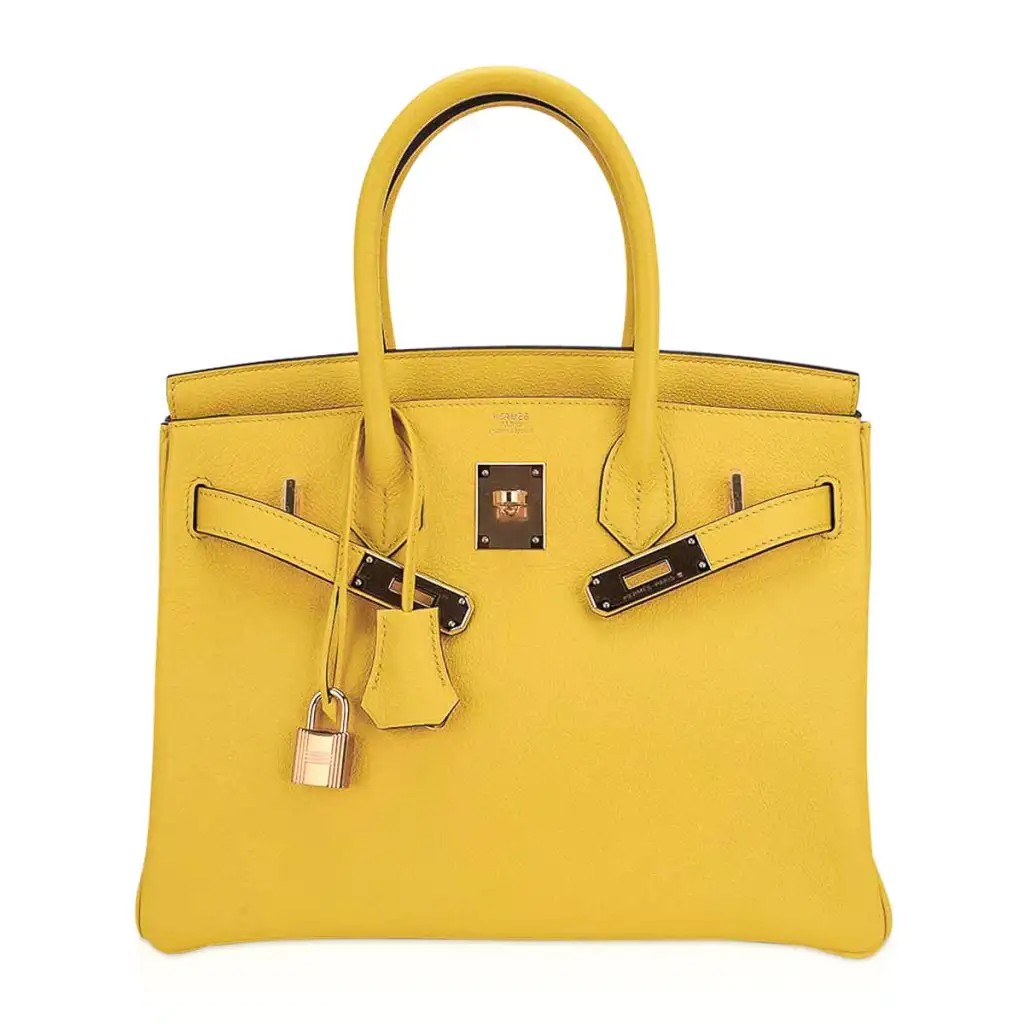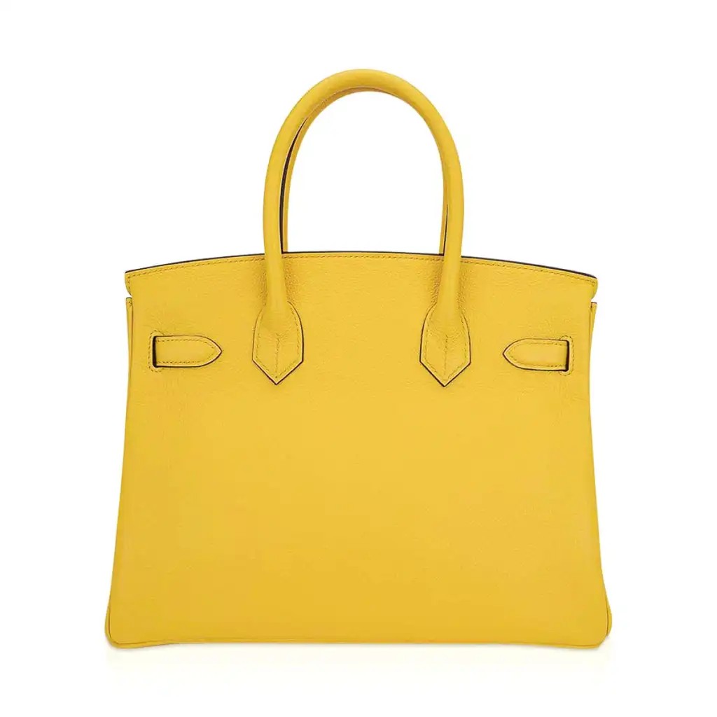 Hermes Birkin 30 bag featured in sunny Jaune de Naples with Gold interior.