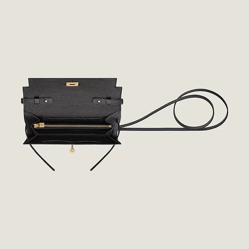 Wallet in Mysore goatskin with removable shoulder strap, 4 credit card slots, zipped change purse and straps with Kelly closure